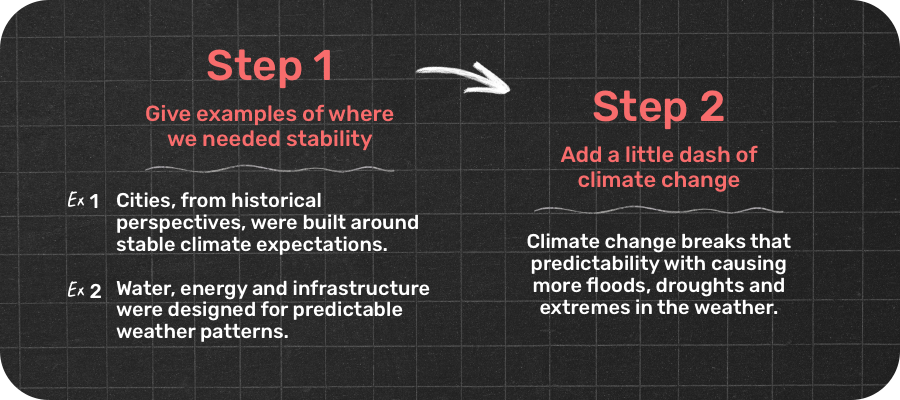 Climate change isn’t just a future problem anymore. It’s already reshaping the world NOW. Make it clear that it's something your audience will have to deal with, within their lifetime. More on this in our podcast about climate adaptation!