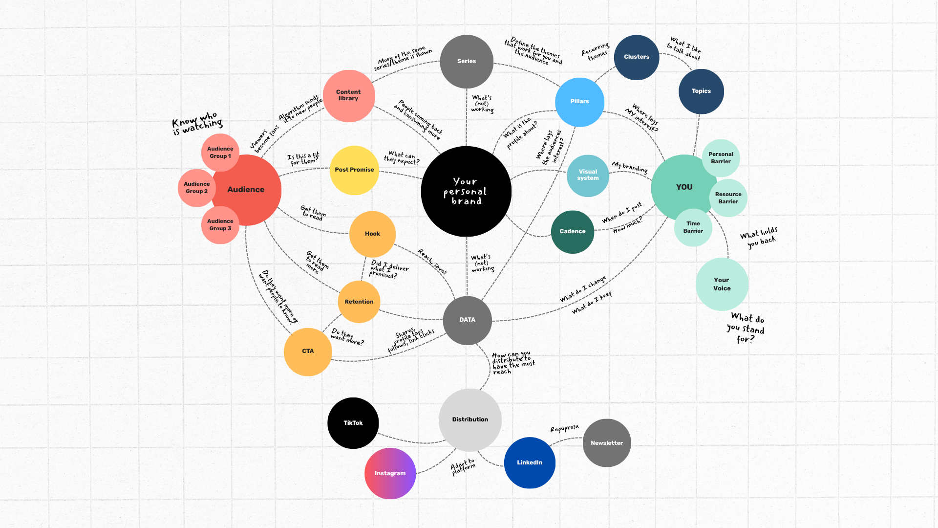 Inside those sessions we used a “helicopter view” of content fit (more below). Because we kept coming back to the same nodes: your voice, time, energy, pillars, series, hooks, retention, CTA, distribution… and data (a lot of data). There was a pattern here.